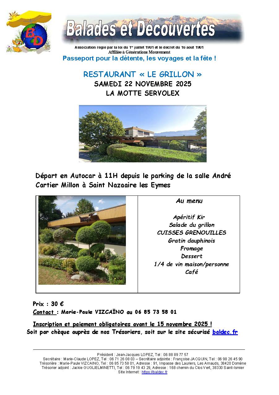 Samedi 22 novembre 2025 Restaurant Le Grillon Cliquer ici pour télécharger le flyer
